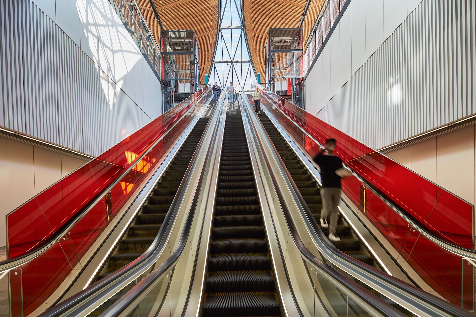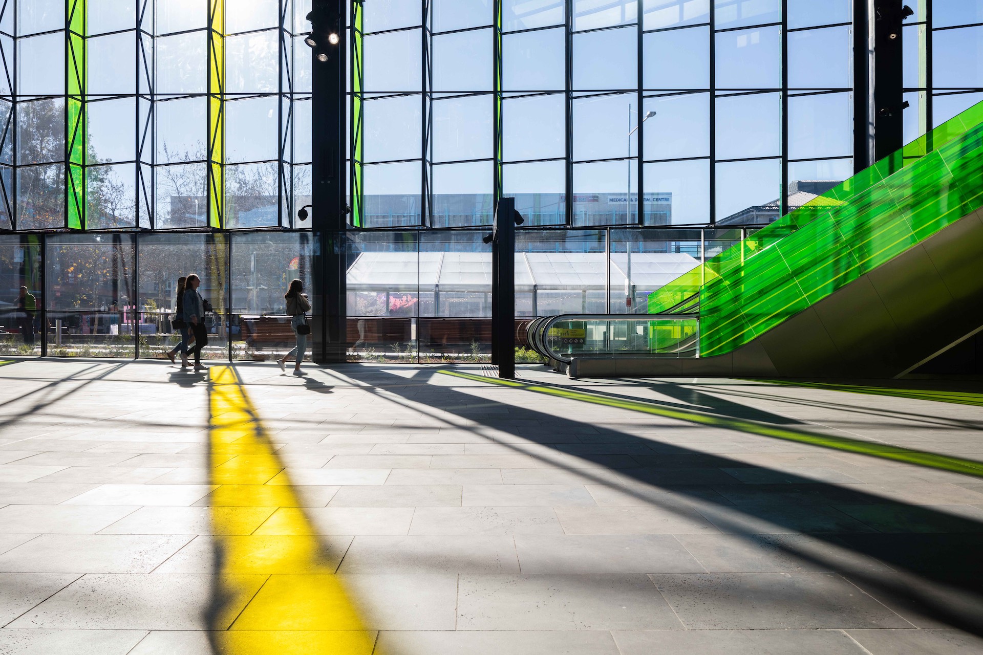 The transparent coloured glazing of the escalator, lift and stairs, make up the Colourways element, which is a signature line-wide element at the 8 stations. The jewel-like transparent colour, and its accompanying, and everchanging, cast light, frames the transition from street, to plaza, to concourse, to platform - guiding the passenger’s journey. From dusk to dawn, and from summer to winter, the Colourways, along with the Skylight Lanterns and Light Screen glazed facades, highlight our experience of diurnal and seasonal time.