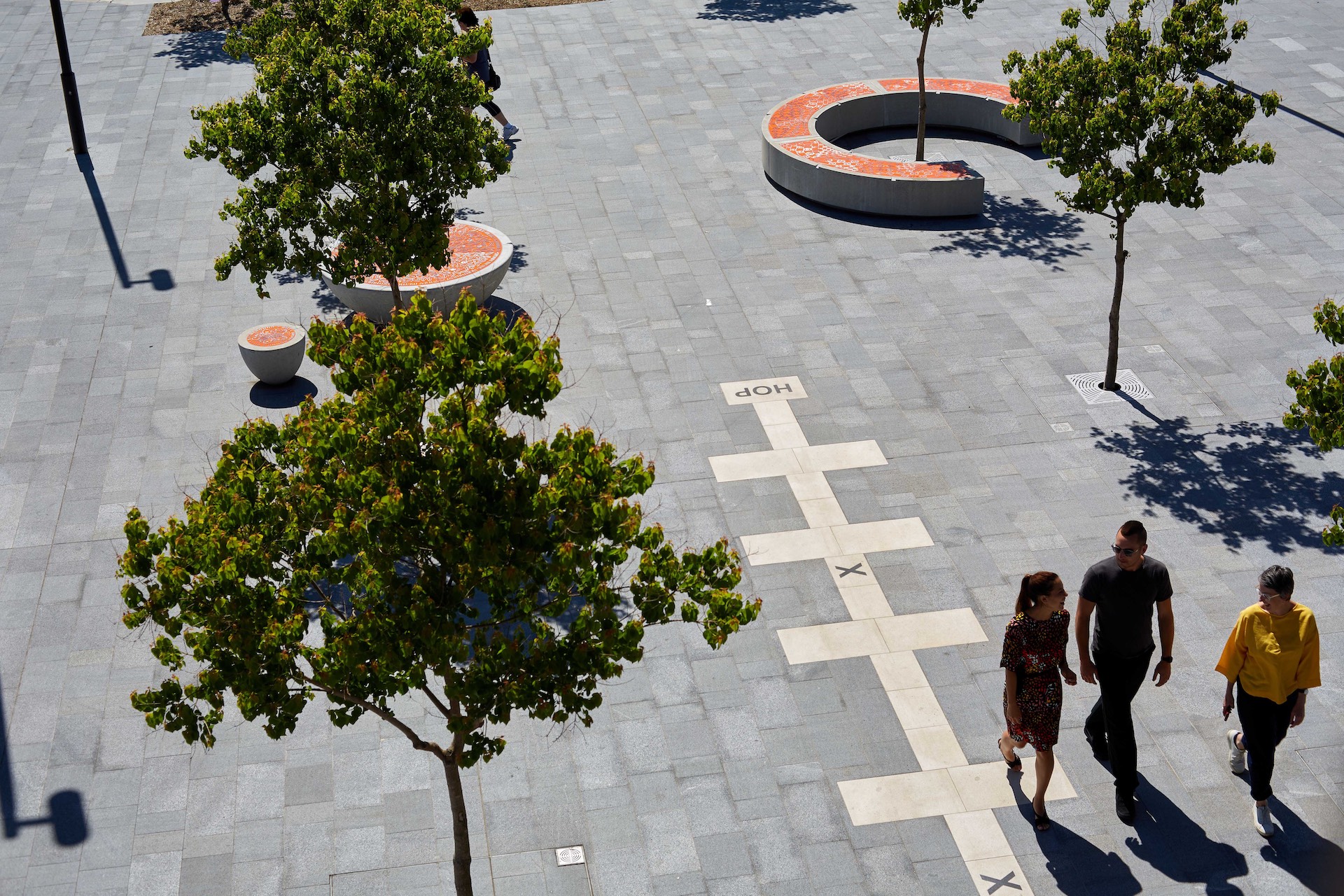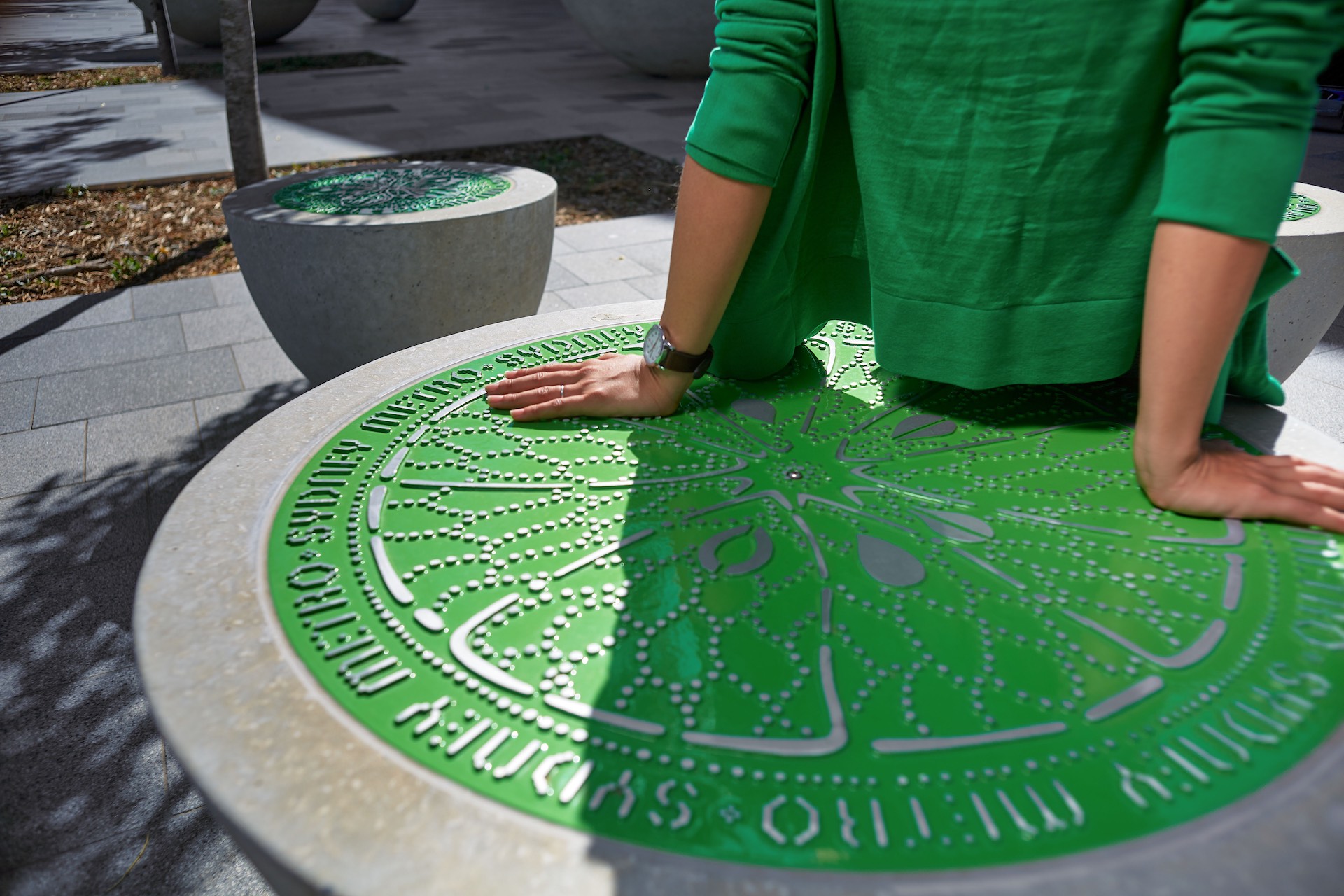 The Social Spheres are a suite of sculptural furniture elements punctuating the 8 station plazas. Richly coloured cast aluminium plates are inlaid into spherical or cylindrical concrete forms. There are 5 types, each with a pattern that references the regions historical orchards including a citrus flower, fruit, tree and field. The Social Spheres are playfully arranged within the Urban Groves - as if fruit fallen from a tree. They offer places for respite and gathering, and give sculptural expression, at a human scale, to the welcoming experience of the station plaza ‘Social Squares’.