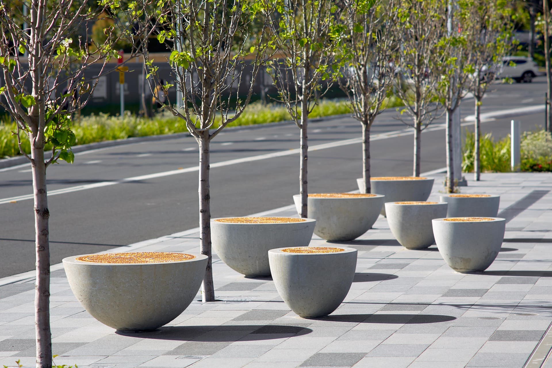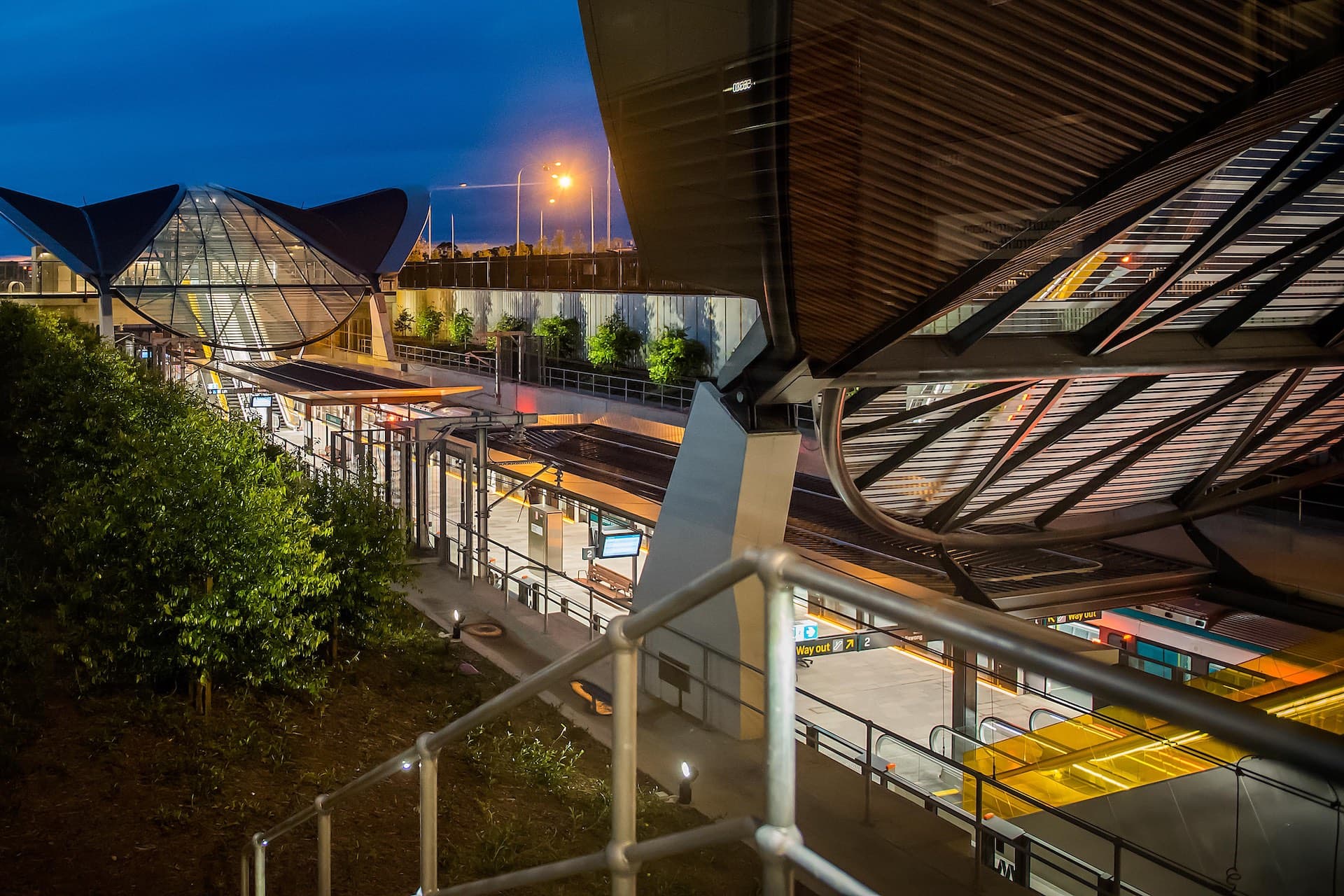 Bella Vista is the second of three open cut stations on the Sydney Metro North West line coming from the city. Trains emerge into the sunny yellow of this open-cut station after 3 underground stations. The platform is framed by the intermittent rhythm of the Terrace Lines glazed yellow tiles, and the Urban Grove terrace landscapes of evergreen Xylosma senticosum trees and carpet of yellow guinea flowers (Hibertia scandens). Light Line, the programmed platform light installation, glows an illuminated yellow as trains enter the station. Transparent yellow glass in the Colourways lifts and escalators, casts golden yellow light over station surfaces. In the station plazas above, Urban Groves of deciduous Callery Pear (Pyrus calleryana) trees, with their yellow autumn leaves, frame arrangements of Social Sphere sculptural furniture with saturated yellow, cast aluminium inlays.