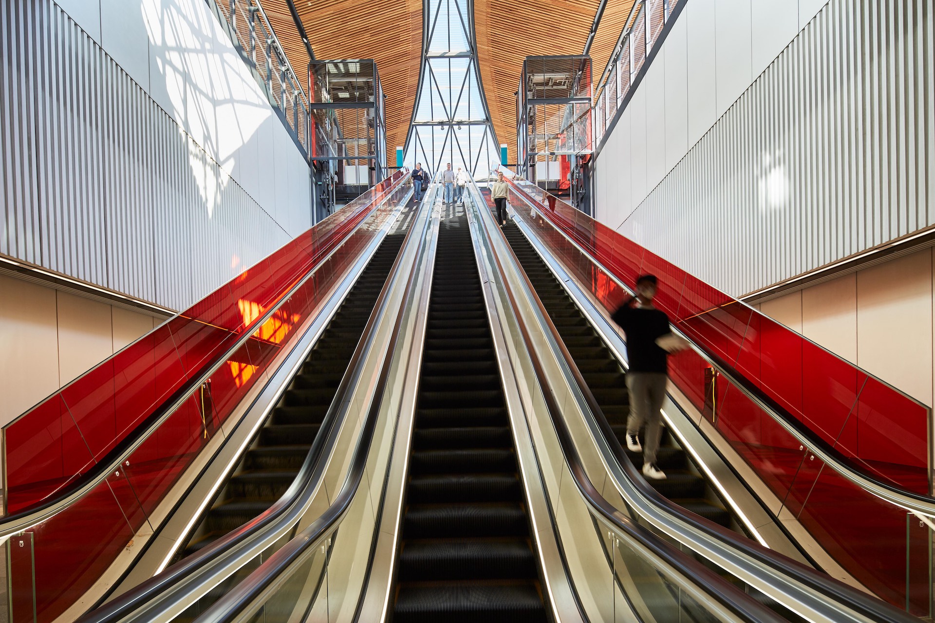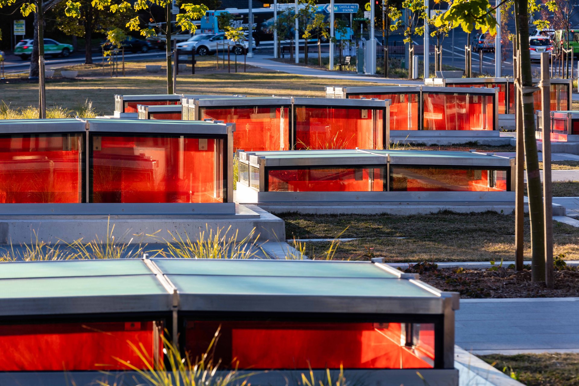 Castle Hill’s signature red is in the transparent coloured glass of the Skylight Lanterns and the Colourways lifts and escalators, the Light Line programmed platform installation, the Social Sphere sculptural furniture arranged in the station plaza and park above, the red, spring flowers of the deciduous Illawarra flame trees (Brachychiton acerifolius) and summer flowering dusky coral pea (Kennedia rubicunda) understory planting.