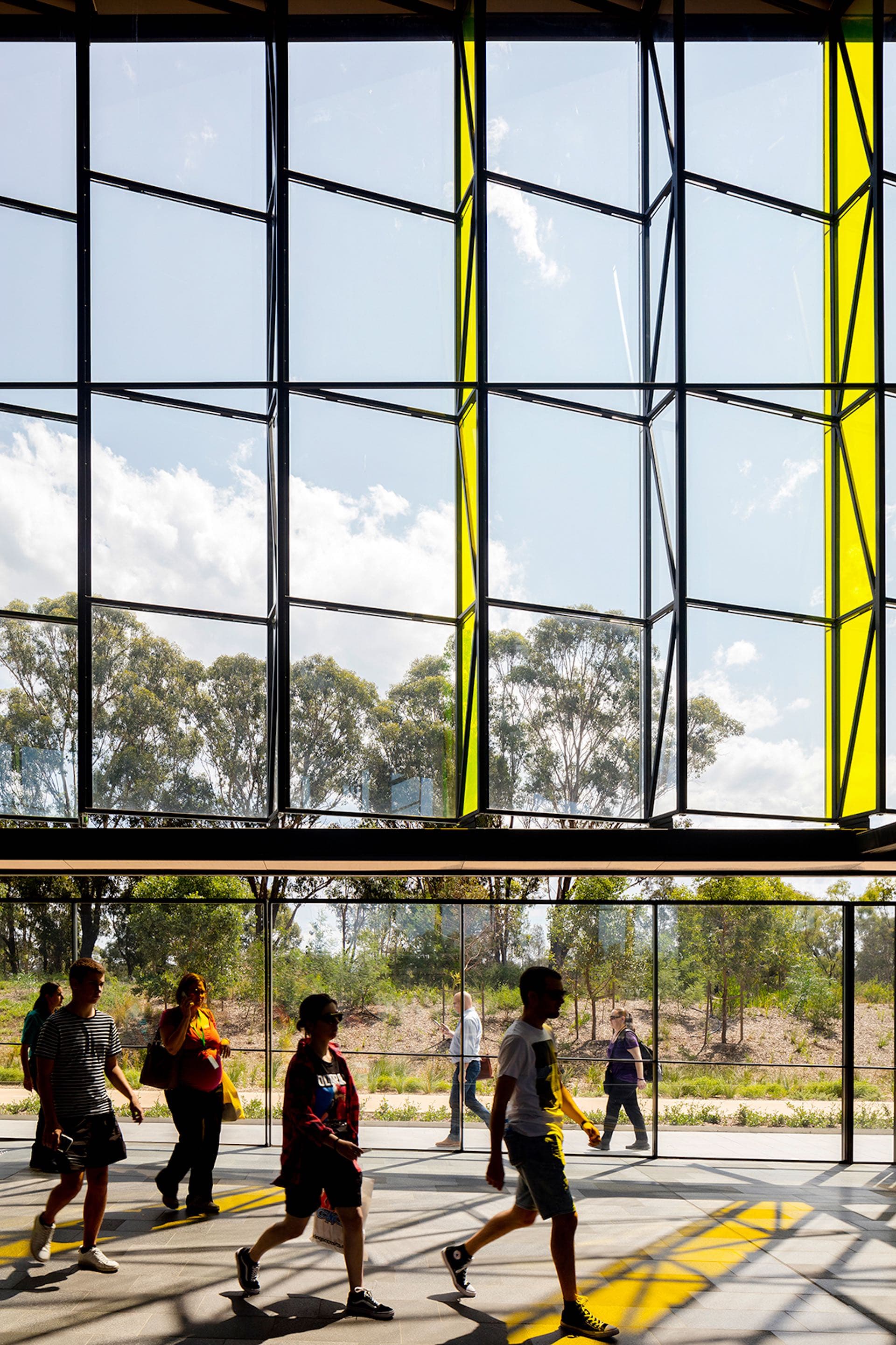 Kellyville is the first of the two adjoining elevated stations on the Sydney Metro North West line coming from the city. The Metro North West travels through the undulating topography of the Hills District from Cherrybrook to Bella Vista, before reaching the Cumberland Plains at Kellyville. The elevated stations are characterised by the Light Screen facades; the expansive Urban Groves and the seasonally operating Cloud Room mist installations that cool the station plazas in the heat of summer. The Light Screens are vast, urban-scaled, glazed screens orchestrated with the colour of the station, and the adjoining stations in both directions. Sunlight casts striking lines of coloured light across station surfaces in a twice-daily solar ‘performance’ as light enters first from the east and then later from the west. At night, these screens glow as if giant stained-glass windows. Along the platform above, from early evening through to early morning, Light Line illuminates in lemon yellow, and the colour of the ensuing station, as trains enter the station.