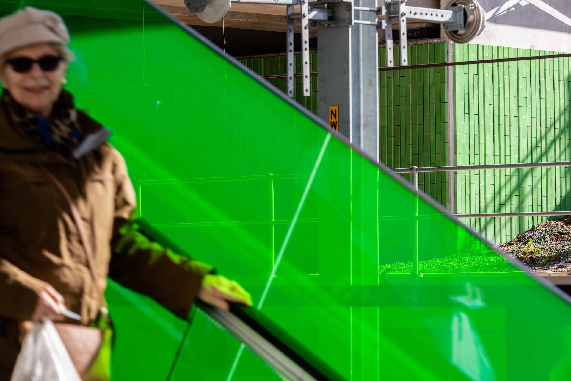 Tallawong is the last, and the first, of three open cut stations on the Sydney Metro North West line. The platform cutting is framed by the intermittent rhythm of Terrace Lines of lime green glazed tiles, and Urban Grove terrace landscapes of sweetly perfumed evergreen orange jasmine (Murraya paniculata) trees and with an understory of Vinca minor ‘Alba’. Light Line, the programmed platform light installation, glows an illuminated green as trains enter the station. Transparent pink glass in lifts and stairs cast swathes of pink light over station surfaces. The Urban Grove of Evergreen Ash (Fraxinus griffithii) trees at the street level plaza, frames a suite of Social Sphere sculptural furniture, with lime green, cast aluminium inlays.