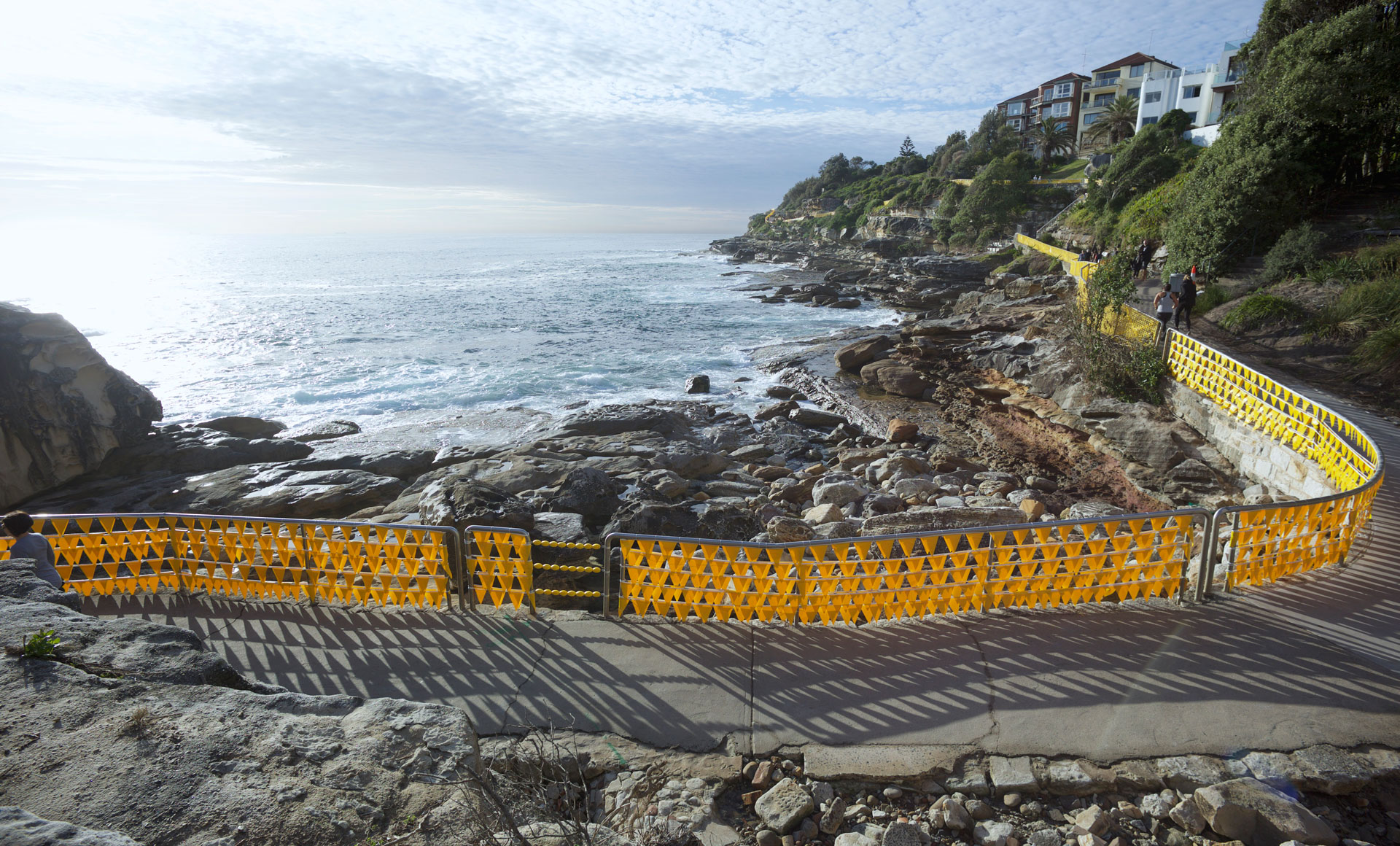 A 500m-long yellow Art-Work-Site ‘safety fence’ surrounded the underwater worksite, a floating buoy marked the site and 3 ‘viewscopes’ on the headland above focused attention on the rehabilitation work below.
