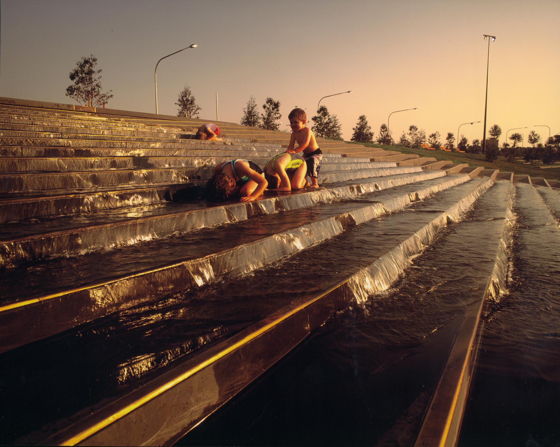 Storm water, once polluted and relegated to the drains, is purified, recycled and returned to the surface to ‘play’. The installation is an integral component of Victoria Park’s environmentally sustainable water treatment process. The artwork employs stormwater harvested in on-site biofiltration swales, treated with electromagnetic filtration and aerated as it falls down the stairs.