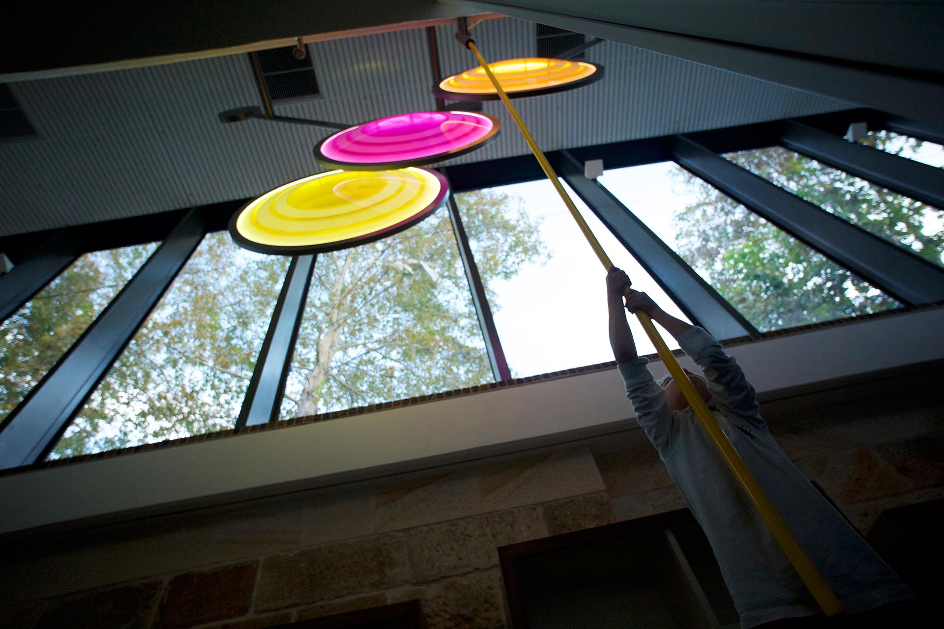 S(w)ing is an artwork at play. Three illuminated pendulum discs swing in a choreography of colour, light and movement. The installation is both interactive and performative. The discs are activated by pulling on ropes within the building at the below street level to create a kinetic performance in the ‘urban window’ of the East Sydney Community and Arts Centre above.