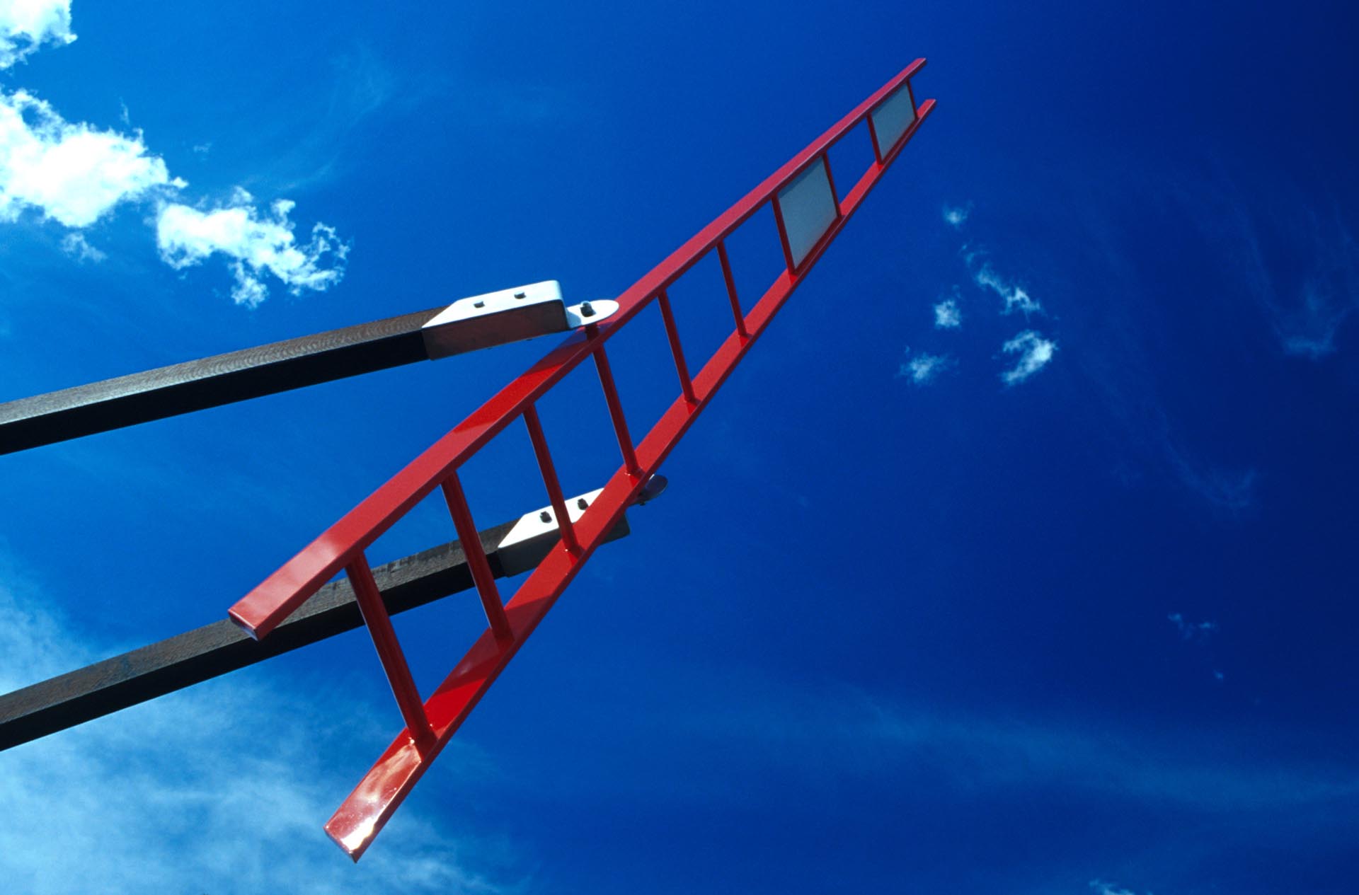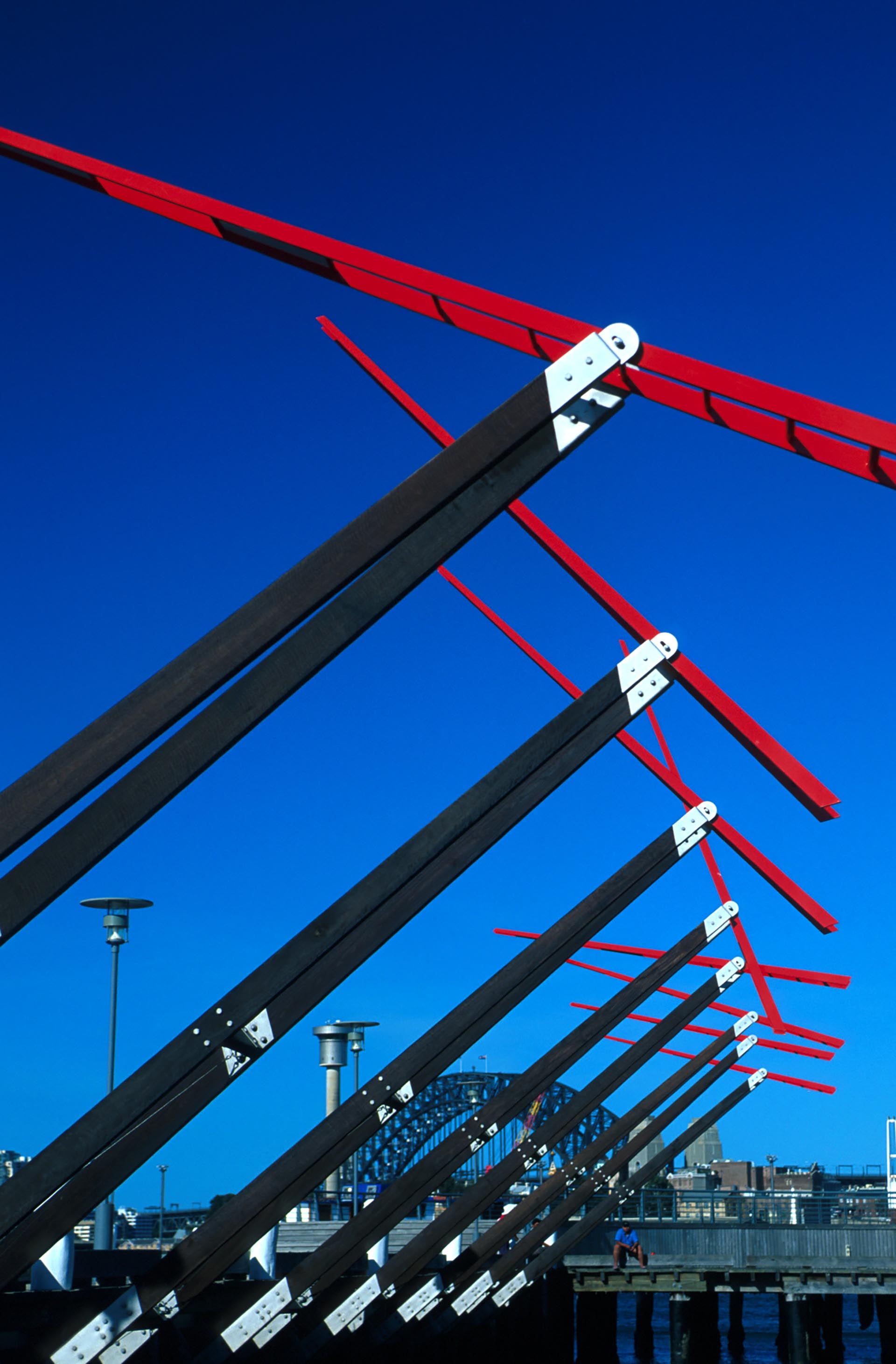 Counter-balanced, maritime-red ladders pivot at the end of the paired timber arms. They act as a barometer of the harbour’s local winds, swaying in the breeze or turning through 360 degrees in strong gusts.