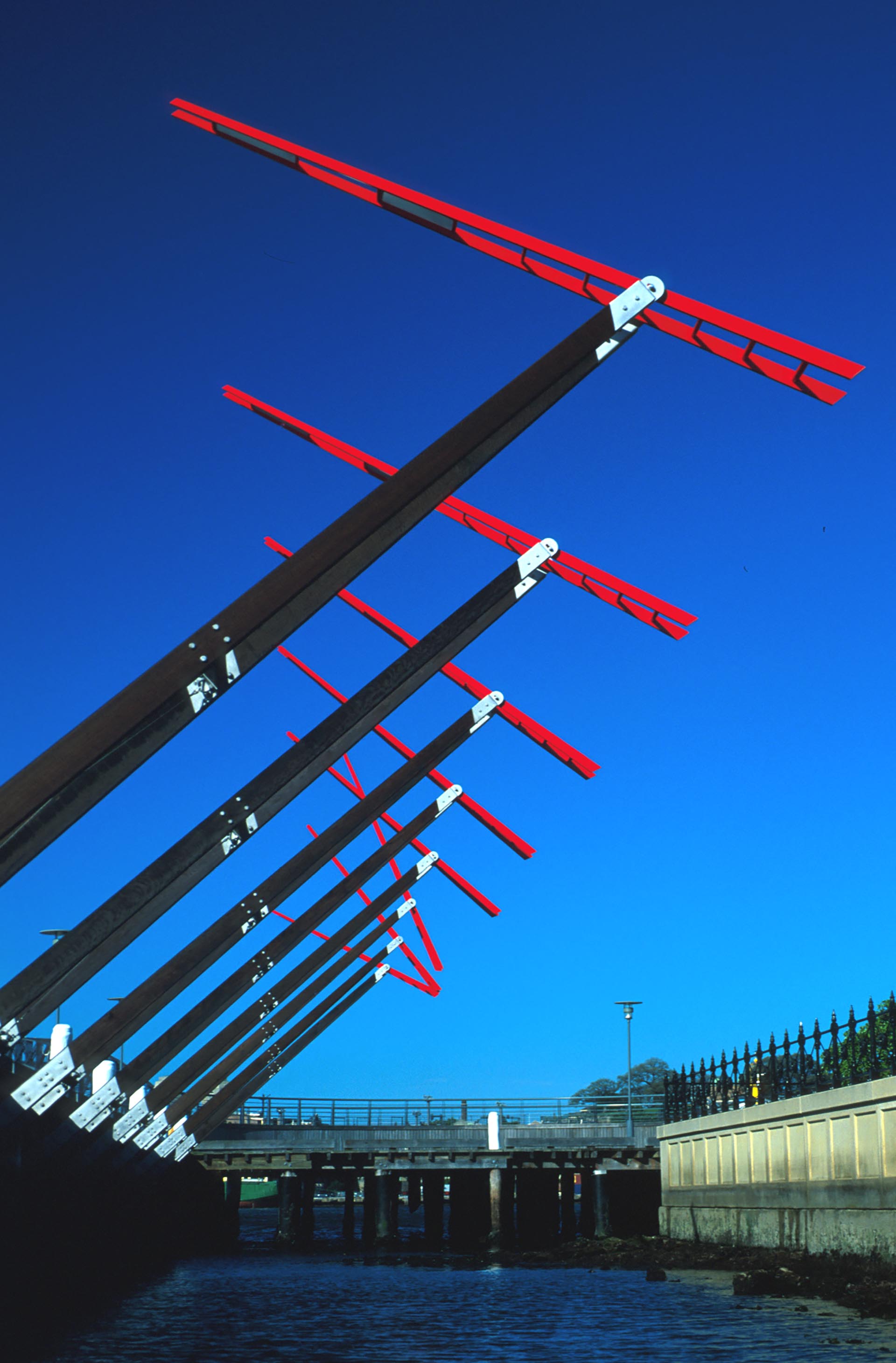 The eight identical elements are hinged to the boardwalk and connected by floats to the water. They translate the eternal return of the tides as the high tide lowers the beams and low tide raises them skyward. The artwork bobs gently on calm waters, dances staccato in a choppy swell and is activated ‘Mexican-wave’ style by the wash of passing boats.