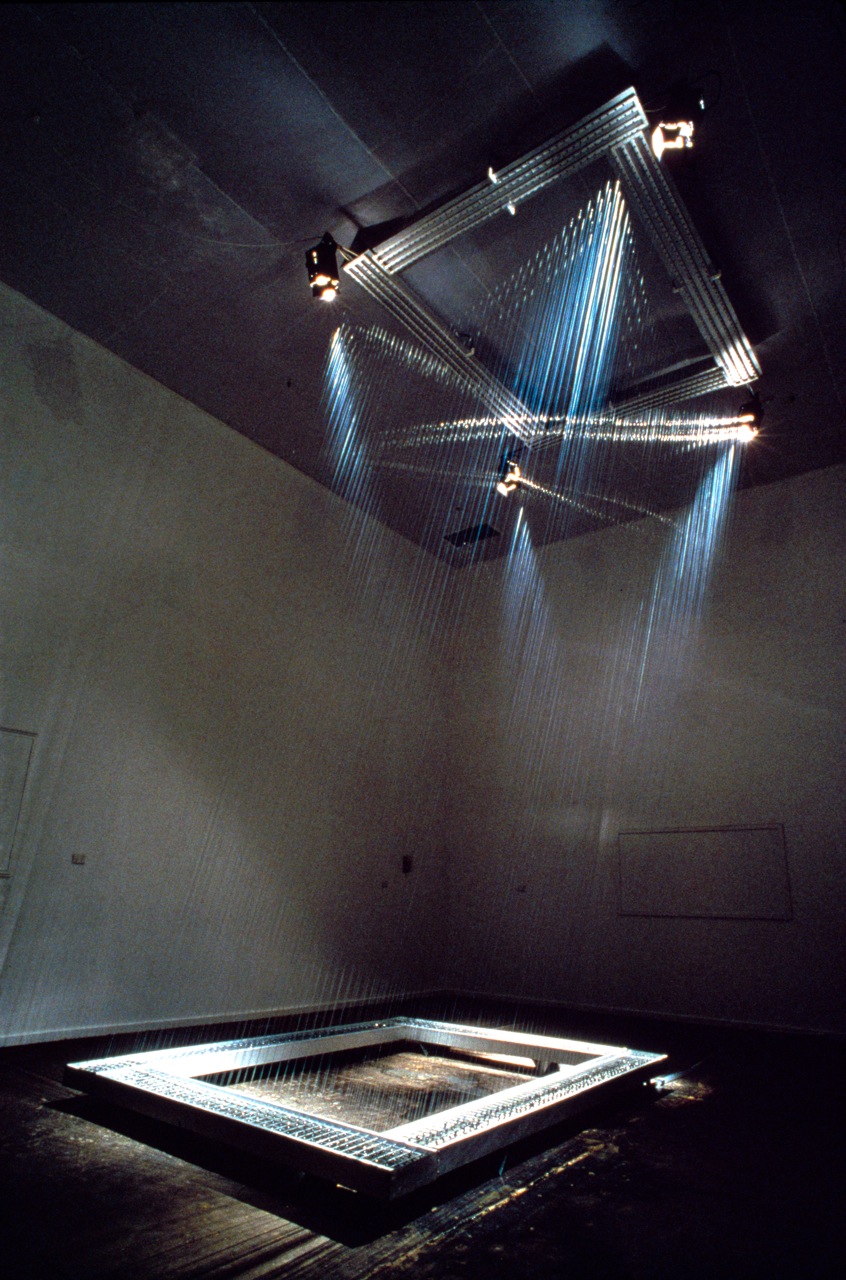 Four angled curtains of water droplets on nylon threads are suspended diagonally in rhomboid form stretching from ceiling to ground. The slow liquid descent transforms the space into a ‘minimalist grotto’.